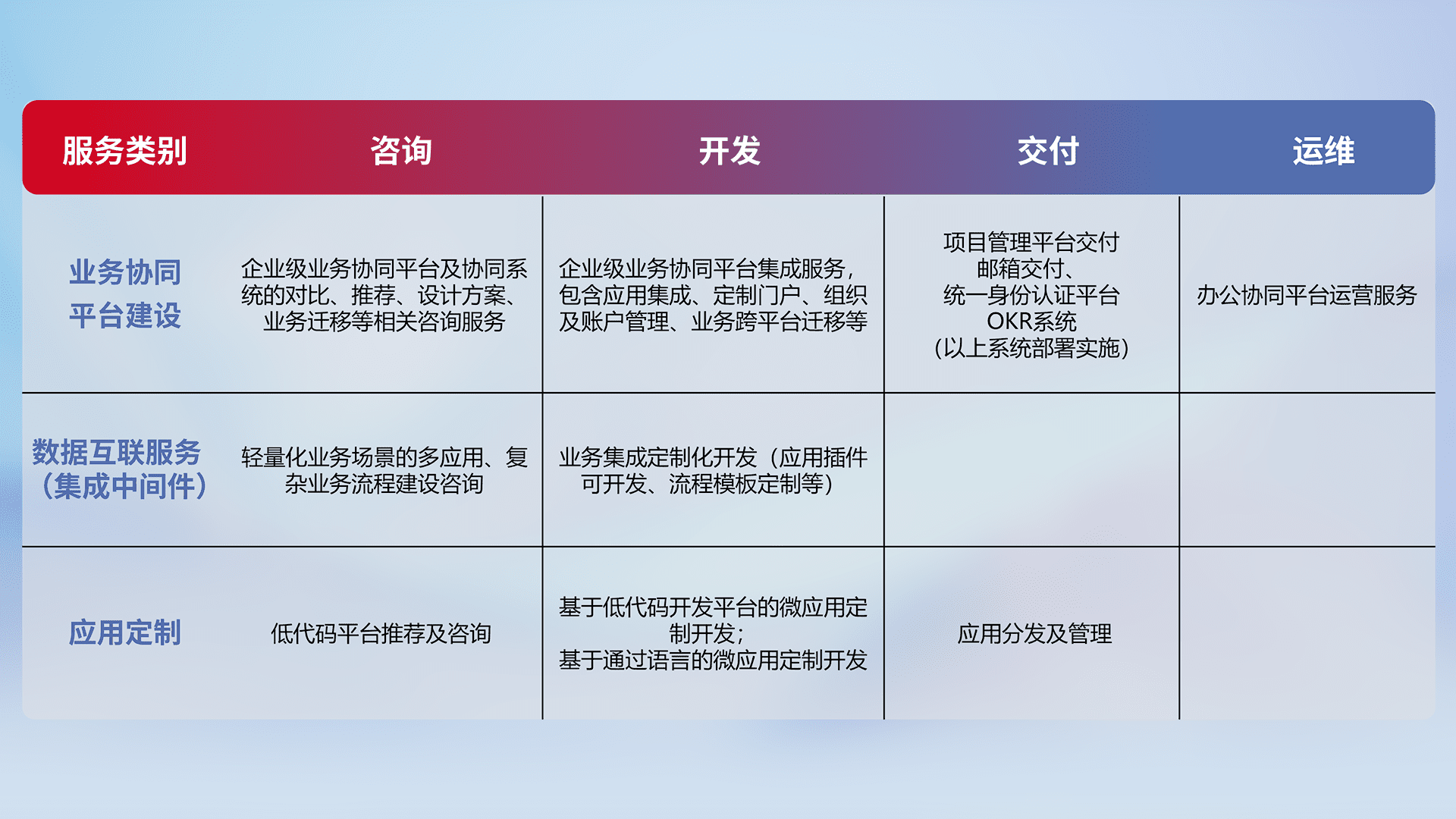 针对钉钉、、企微、、、、IDaas等平台级产品提供产品的规划、、、、方案、、、交付、、定制化开发等服务,,实现如统一协同办公、、、、智能客户服务、、、、混合会议管理、、、智能数据查询、、、、等业务场景,,,,实现数字化转型。。。。